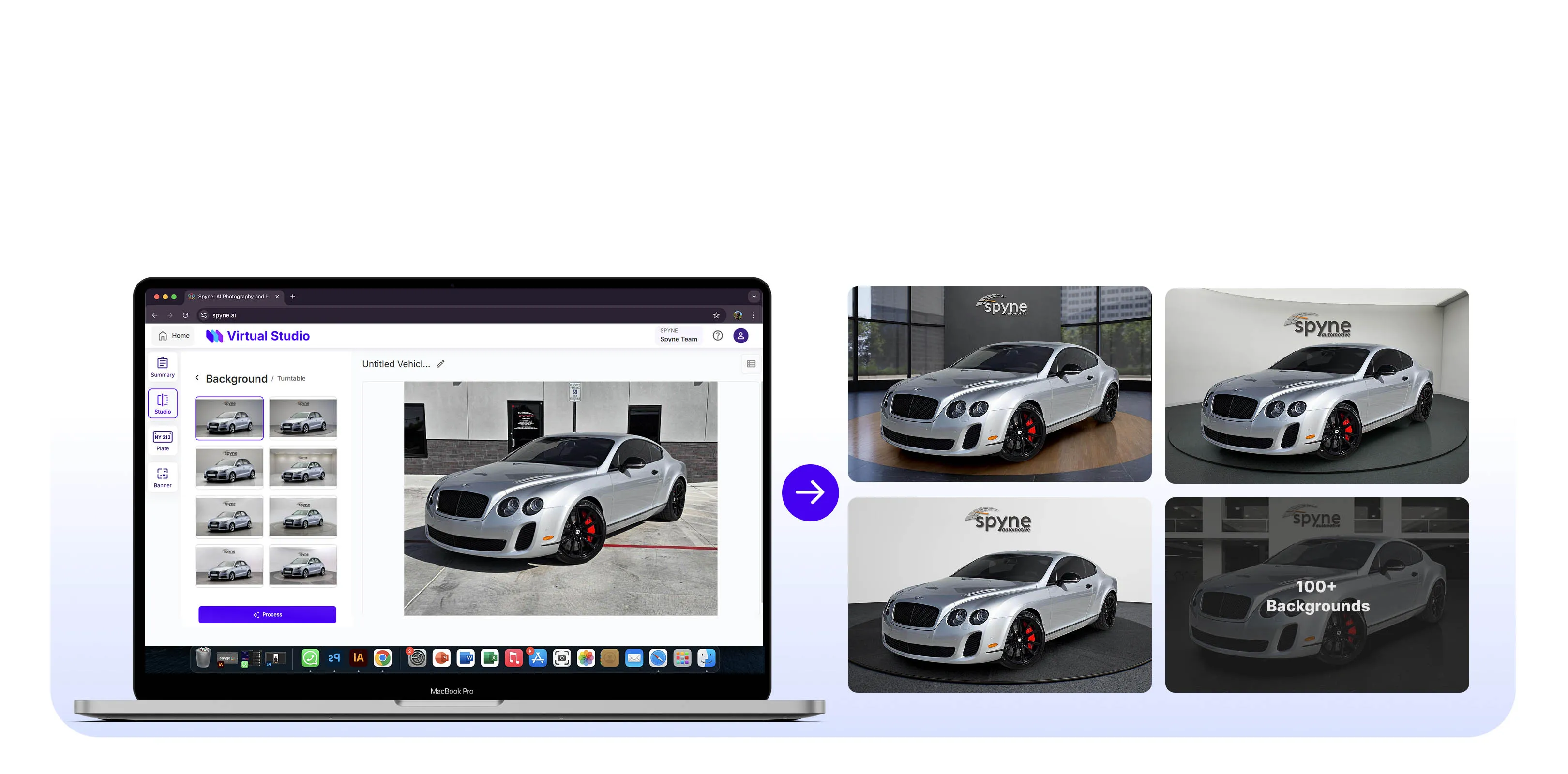 Spyne’s AI-powered platform ensures your car images are paired with the perfect backdrop, enhancing their appeal and professionalism.